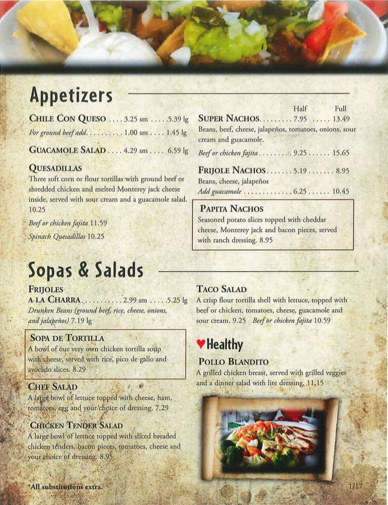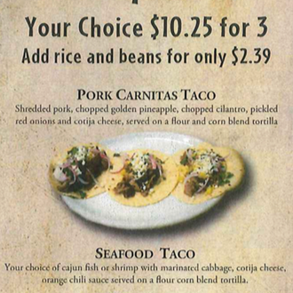 Three flour tortillas filled with beef or chicken fajita, served with frijoles a la charra, pico de gallo and a guacamole salad