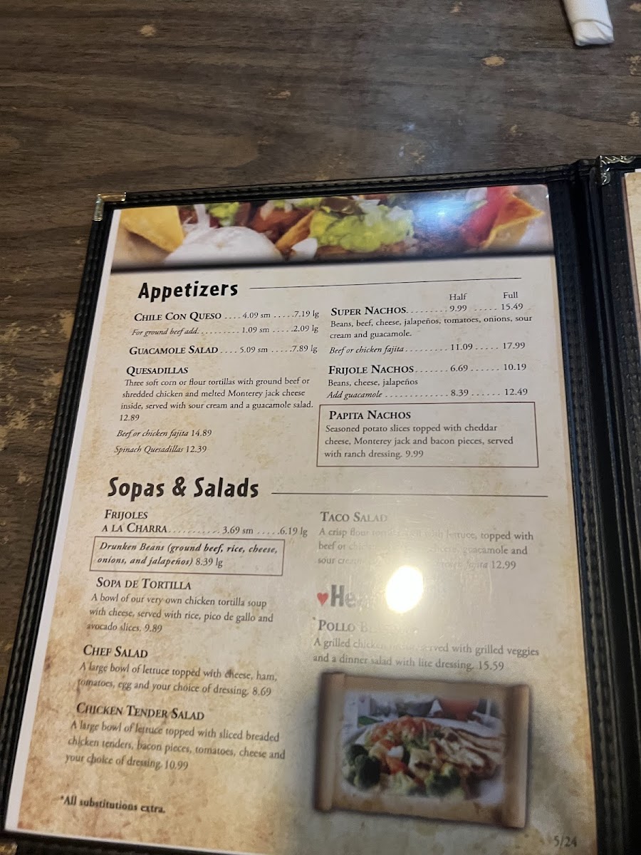 Beans, beef, cheese, jalapenos, tomatoes, onions, sour cream and guacamole