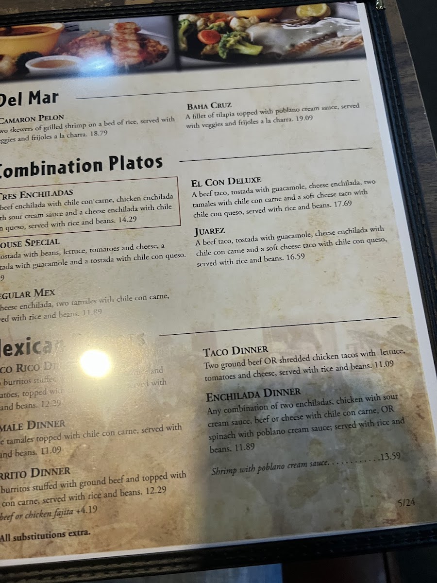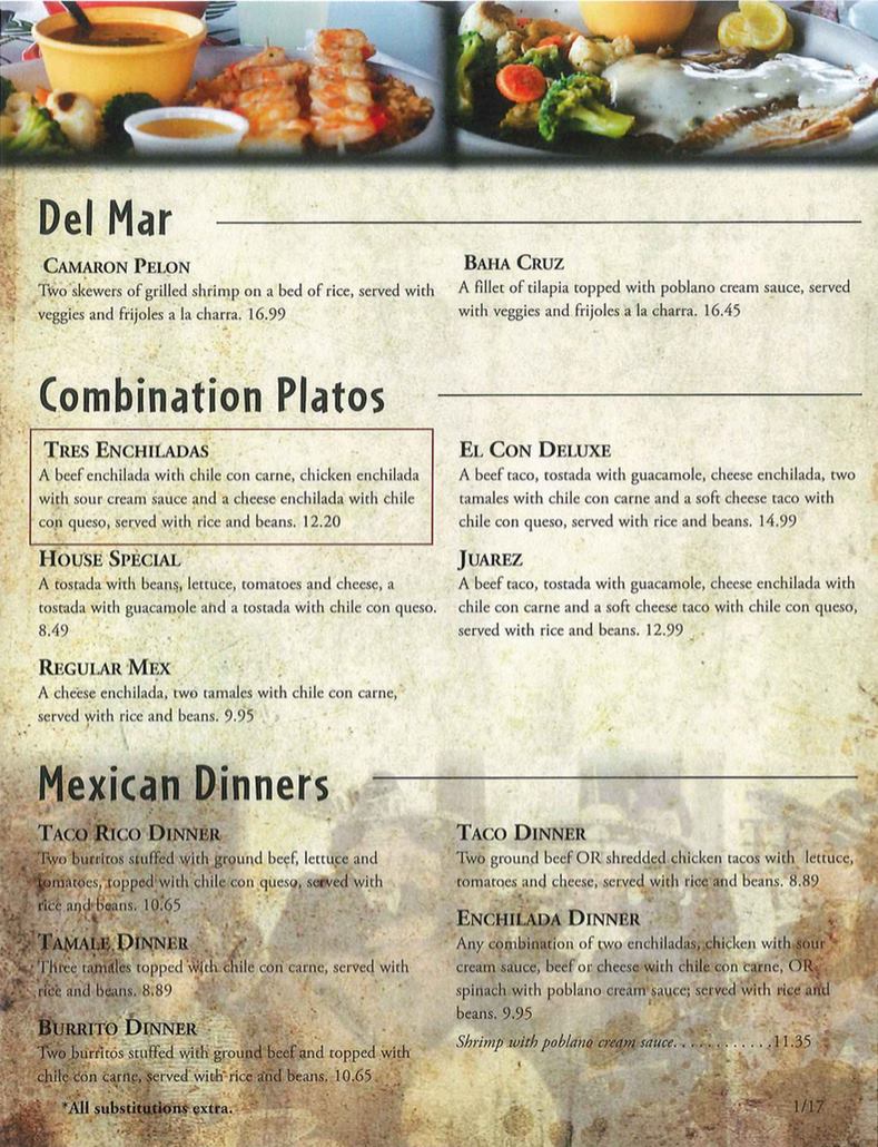 Any combination of two enchiladas, chicken with sour cream sauce, beef or cheese with chile con carne, or spinach with poblano cream sauce; served with rice and beans
